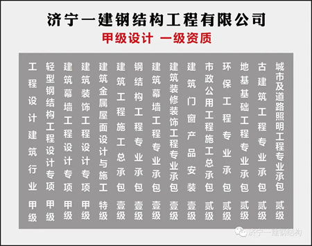 济宁市一建钢组成工作有效总部,归属于中煤搭建群体,群体登记金额1.01585亿群众币,下辖工作部、制定部、技巧部、質量检验部、开发部、安会部。占有钢组成进行、制定双甲相关的资格证书证书、开发壹级相关的资格证书证书,外墙干挂石材进行、制定双甲相关的资格证书证书,装璜新房装修进行、制定双甲相关的资格证书证书,房屋黑色金属平屋面制定与进行高级相关的资格证书证书,窗门进行壹级相关的资格证书证书,并拥有进行企业承包进行相关的资格证书证书和劳务工效果相关的资格证书证书等九项一个国家地区甲级相关的资格证书证书。重点长期从事钢组成yy易游体育