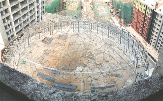 该工程位于河南省信阳市,yy易游体育 结构形式为正放四角锥(球形)螺栓球节点碳钢yy易游体育 ,上下弦多柱点支承,直径50.472米、建筑面积2046平方米,造价52万,屋面结构找坡。