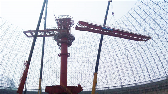 该网壳工程位于江苏省盐城市滨海县滨海港,属于球壳网壳结构,直径为128米,网壳顶高85米,支座支承方式采用下弦柱点支撑方式,竖向支承面标高26.1m,支座中心布置在直径为128米的圆周上,按每10度设一个支座,共36个支座。屋面采用单层压型彩钢板+采光板,彩钢板采用0.6mm厚YX35-280-840型蓝灰色镀铝锌彩色压型钢板,自由排水。网壳顶部设置圆形天窗用于通风。