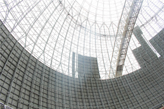 该网壳工程位于江苏省盐城市滨海县滨海港,属于球壳网壳结构,直径为128米,网壳顶高85米,支座支承方式采用下弦柱点支撑方式,竖向支承面标高26.1m,支座中心布置在直径为128米的圆周上,按每10度设一个支座,共36个支座。屋面采用单层压型彩钢板+采光板,彩钢板采用0.6mm厚YX35-280-840型蓝灰色镀铝锌彩色压型钢板,自由排水。网壳顶部设置圆形天窗用于通风。