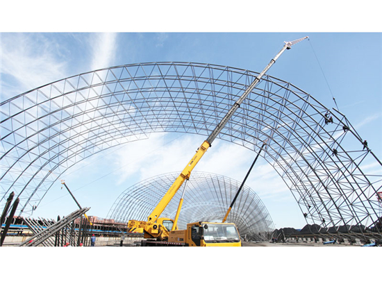 本yy易游体育 位于内蒙古乌海市,星光煤炭储煤场封闭yy易游体育 项目,yy易游体育 跨度85米,长165米;本工程采用内弦支撑,以方便提高内部使用率,yy易游体育 展开面积含钢量为26.3kg/m;檁条每平方展开含钢量为7kg/m";yy易游体育 山墙利用竖向yy易游体育 封闭,本工程施工周期96天,屋面采用O.6mm厚彩钢板,施工方案为,在中间设置两条起步架,进行高空拼装,共有4个作业面进行施工,很大程度提高了施工速度,完美的诠释了yy易游体育 成熟的施工组织设计,得到业主认可。